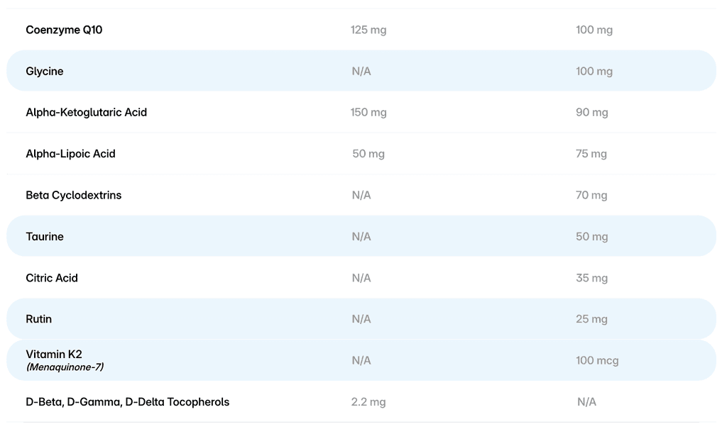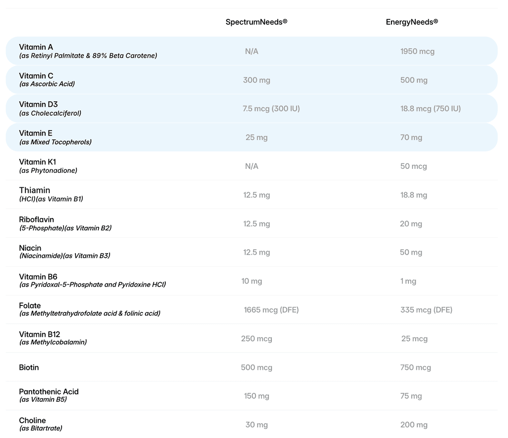 Immune support refers to practices and nutrients that help maintain or enhance the function of the immune system. A strong immune system is crucial for defending the body against infections and diseases. Although both SpectrumNeeds and EnergyNeeds provide immune support, EnergyNeeds contains some added ingredients that are not available in SpectrumNeeds along with higher dosing of specific mitochondrial support ingredients (shown below) which positions EnergyNeeds as a more comprehensive “mito cocktail” targeted toward adolescent and adult users, who can swallow capsules.