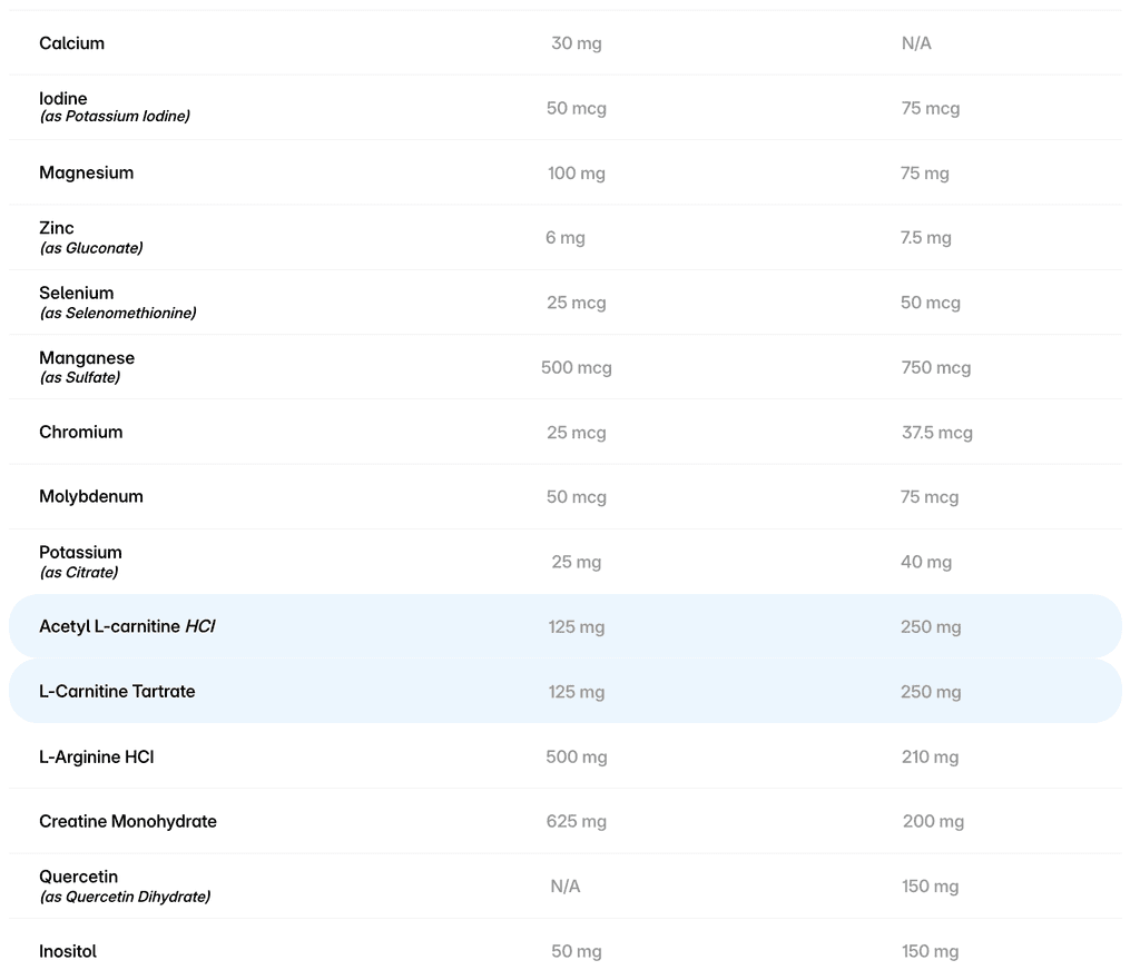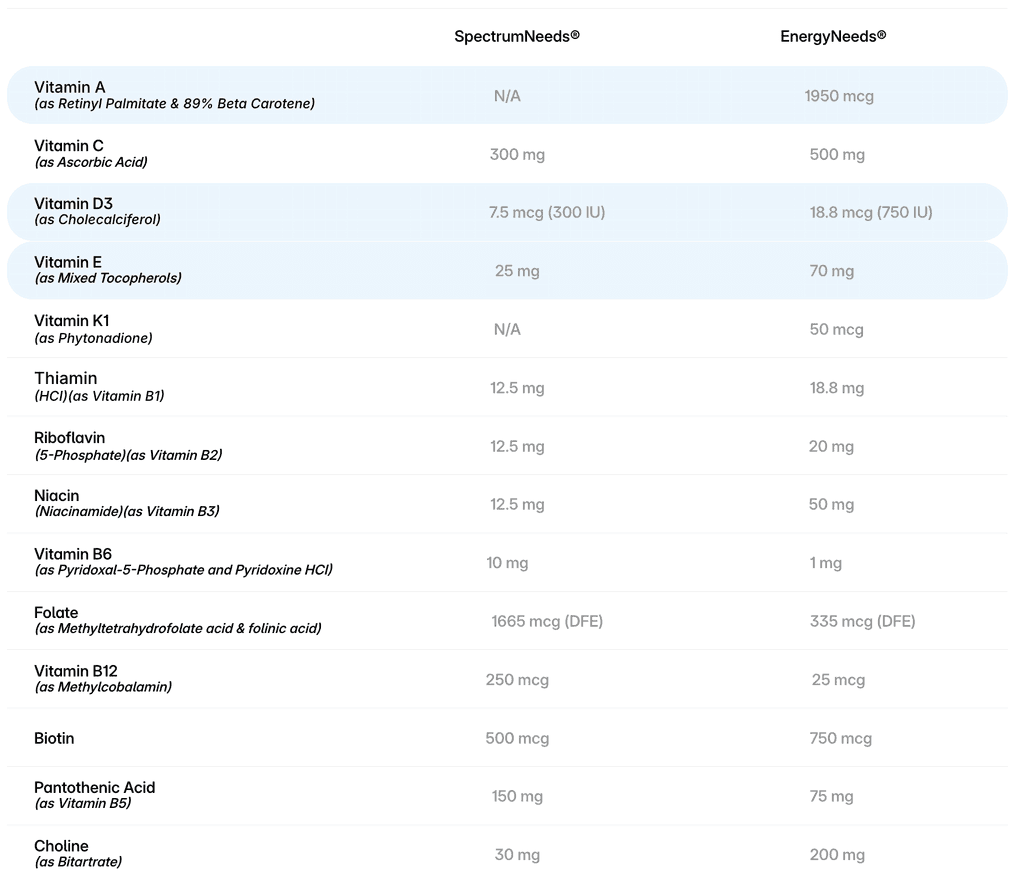 Mitochondria are commonly known as the “powerhouse of the cell”, and they produce the vast majority of energy that cells use. Mitochondria serve many other purposes, but their main function is energy production. Approximately 20 ingredients in both products are focused on “mito” support (mitochondrial energy metabolism) while the remainder support general neuro-nutrition. However, EnergyNeeds contains some added ingredients that are not available in SpectrumNeeds along with higher dosing of specific mitochondrial support ingredients (shown below) which positions EnergyNeeds as a more comprehensive “mito cocktail” targeted toward adolescent and adult users, who can swallow capsules.